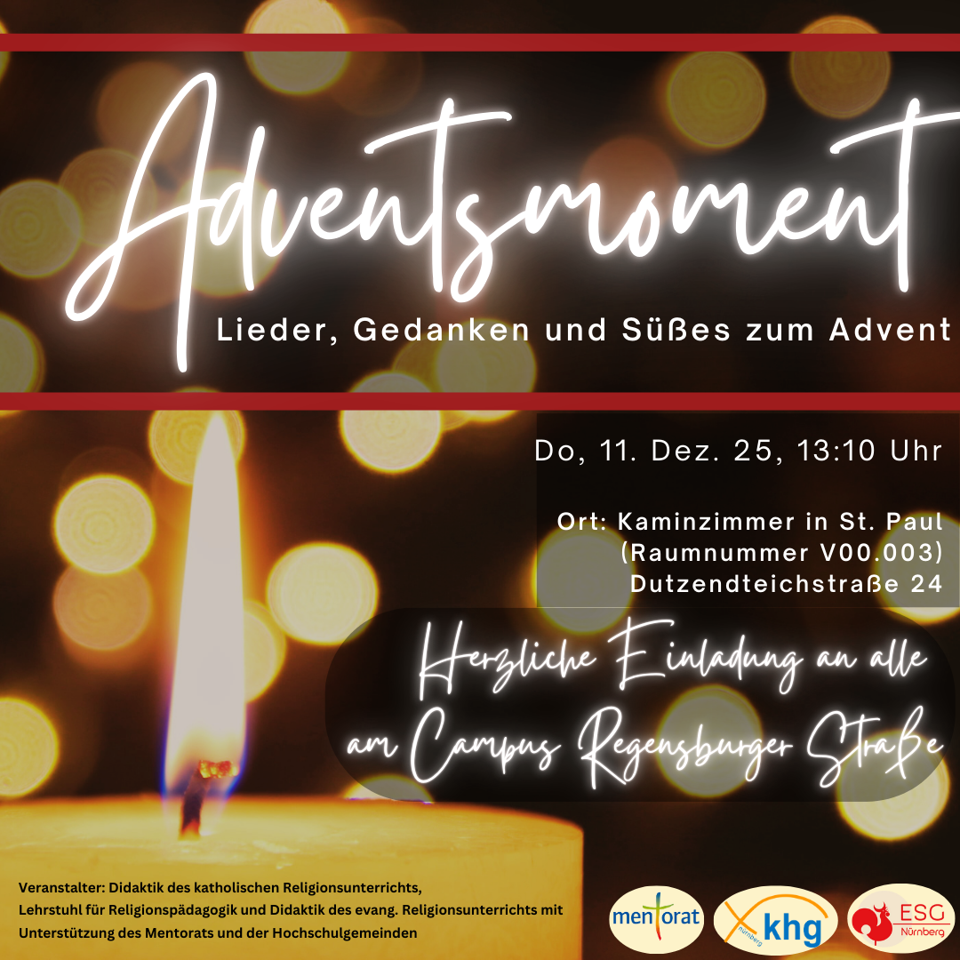 Die Didaktik des katholischen Religionsunterrichts und der Lehrstuhl für Religionspädagogik und Didaktik des evangelischen Religionsunterrichts laden mit Unterstützung des Mentorats und der Hochschulgemeinden zum Adventsmoment am 11.12.25 um 13:10 Uhr ins Kaminzimmer in St. Paul (Dutzendteichstraße 24, Raum V00.003) ein. Kommen Sie gerne vorbei und stimmen Sie sich mit uns auf eine besinnliche Weihnachtszeit ein.